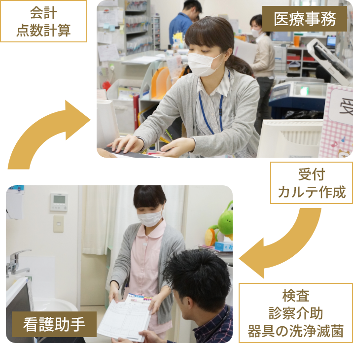 患者さまの受診に関わる実務に幅広く携わることで様々な気づきや、学ぶポイントを早期に見出せます。